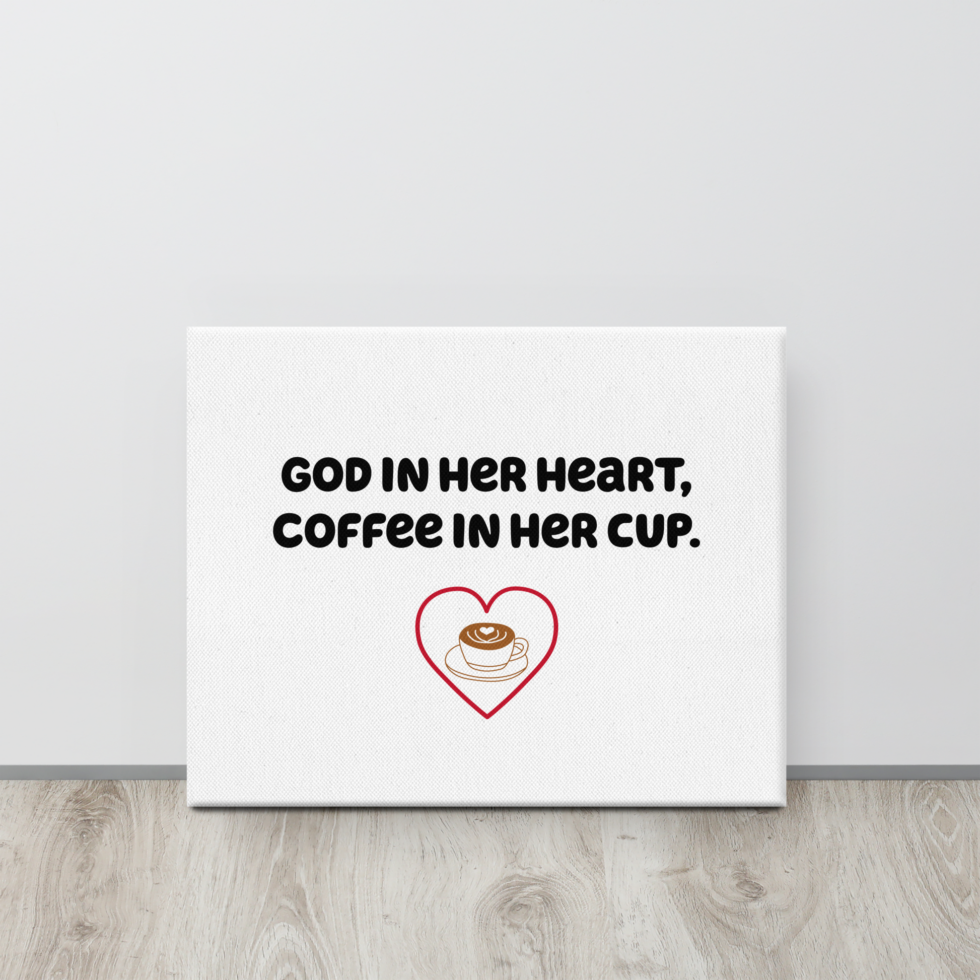 This Graceful Grind canvas features the quote "God in her heart, Coffee in her cup" to inspire and uplift. Perfect for coffee lovers and those seeking daily inspiration.